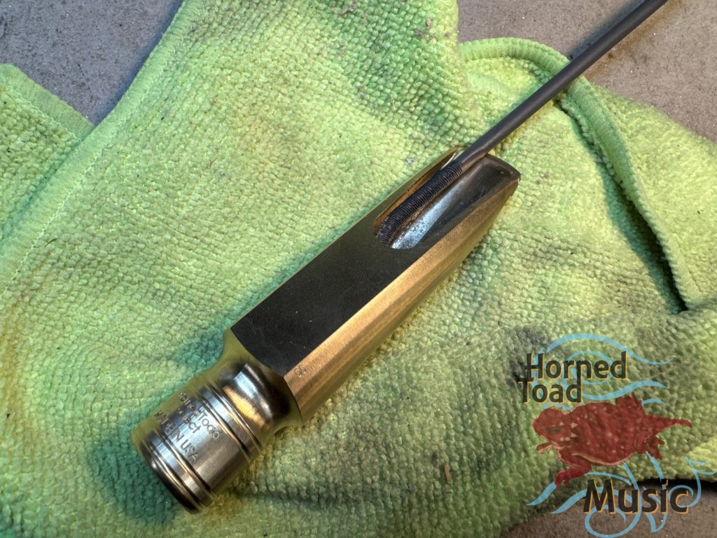 Otto Link Baritone FL Double Ring 5*. This piece has a tip size of .110. Facing is original and clean. I have polished the tip rail and baffle ascent only, smoothing some small dings that are common with well loved pieces of this age.